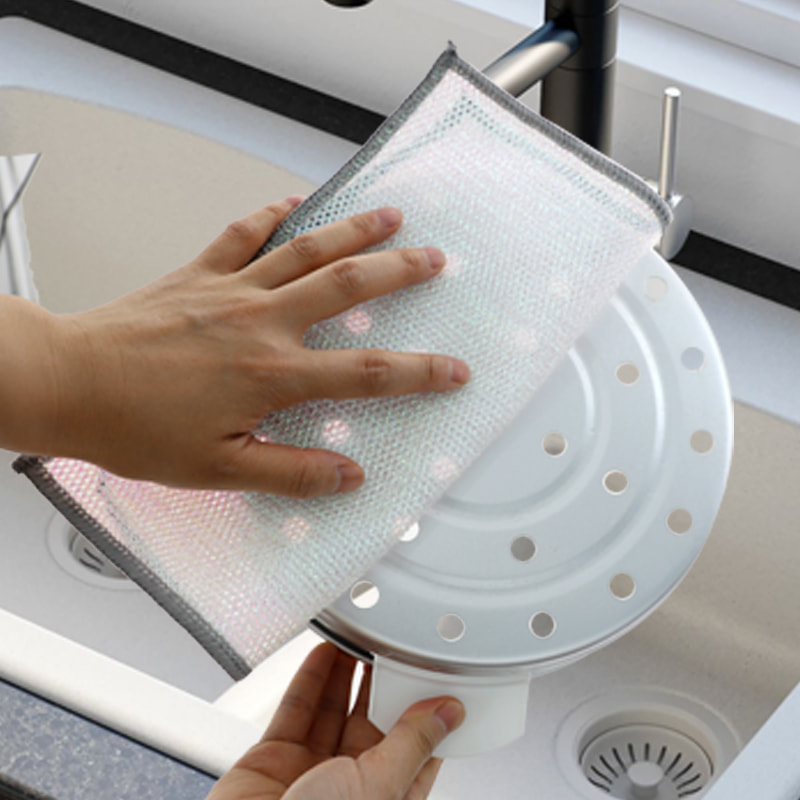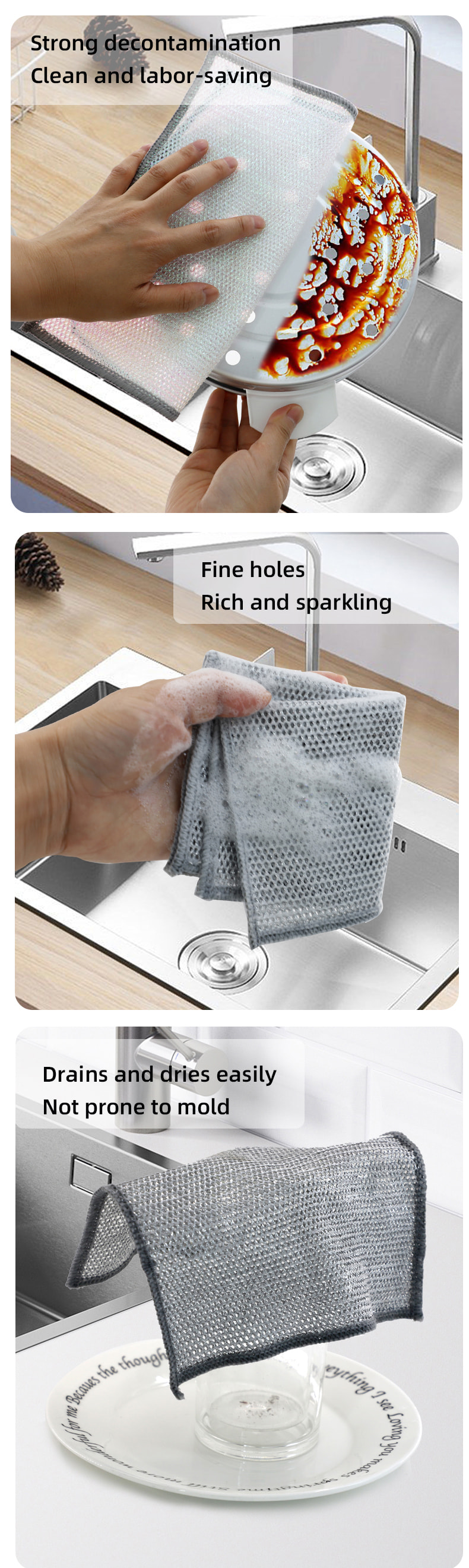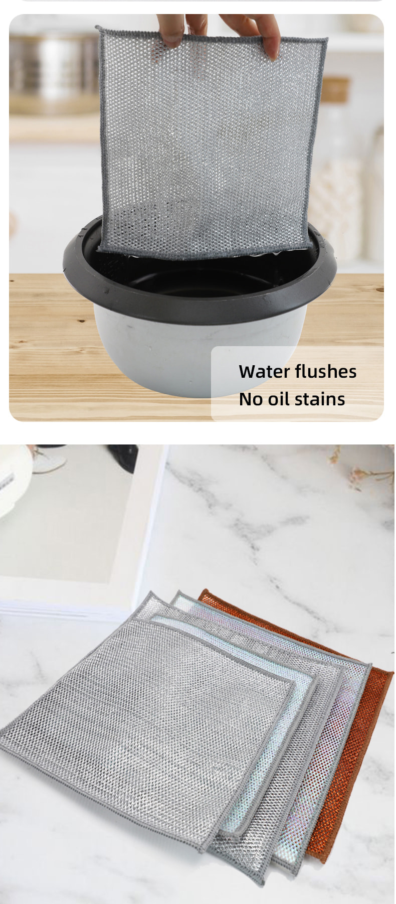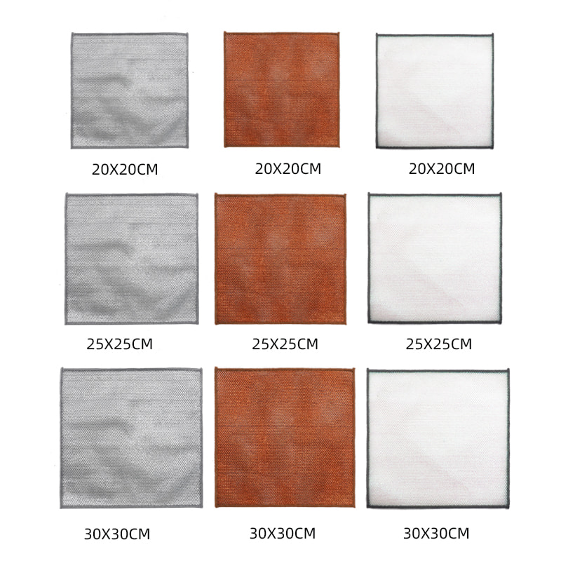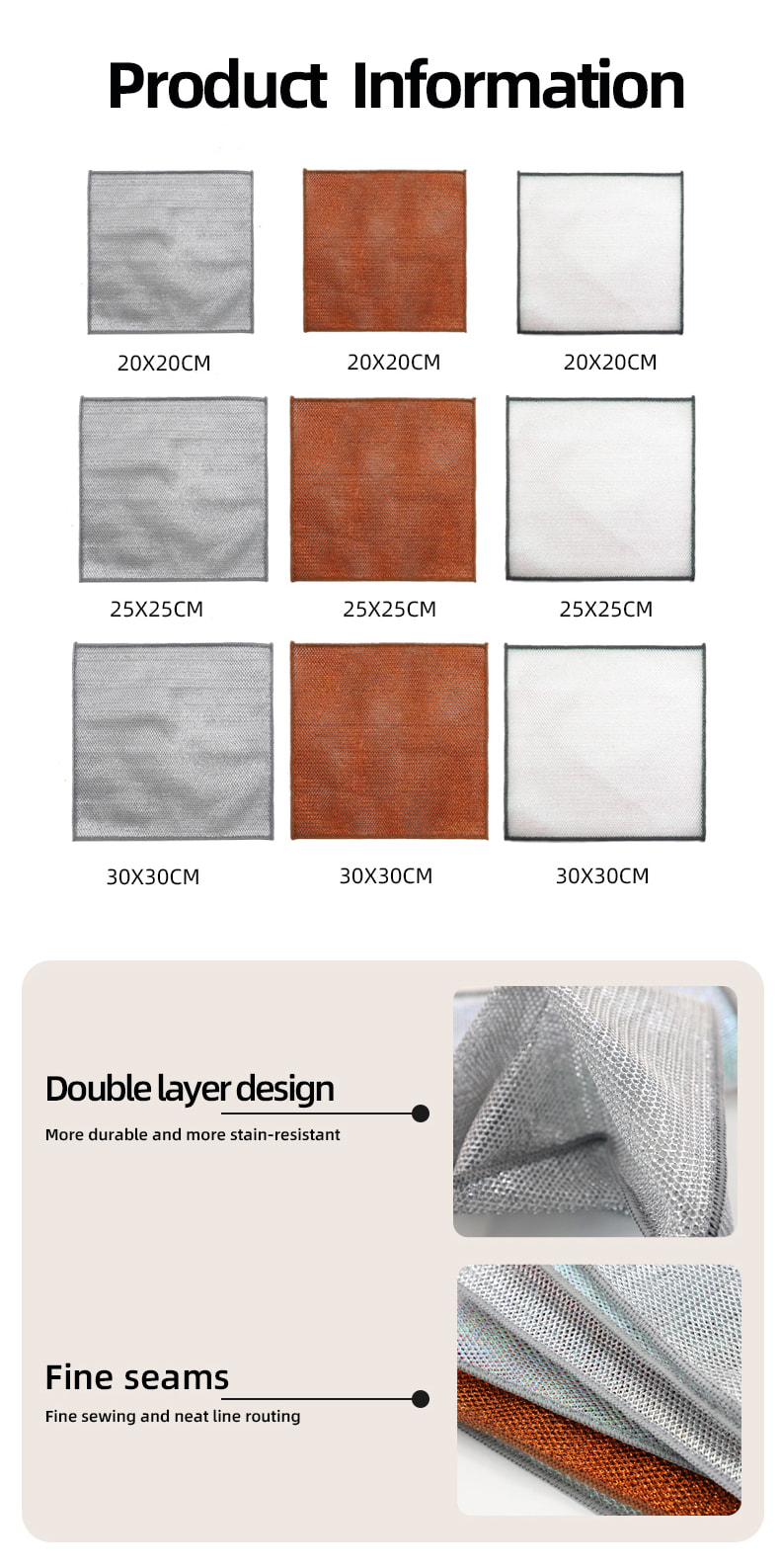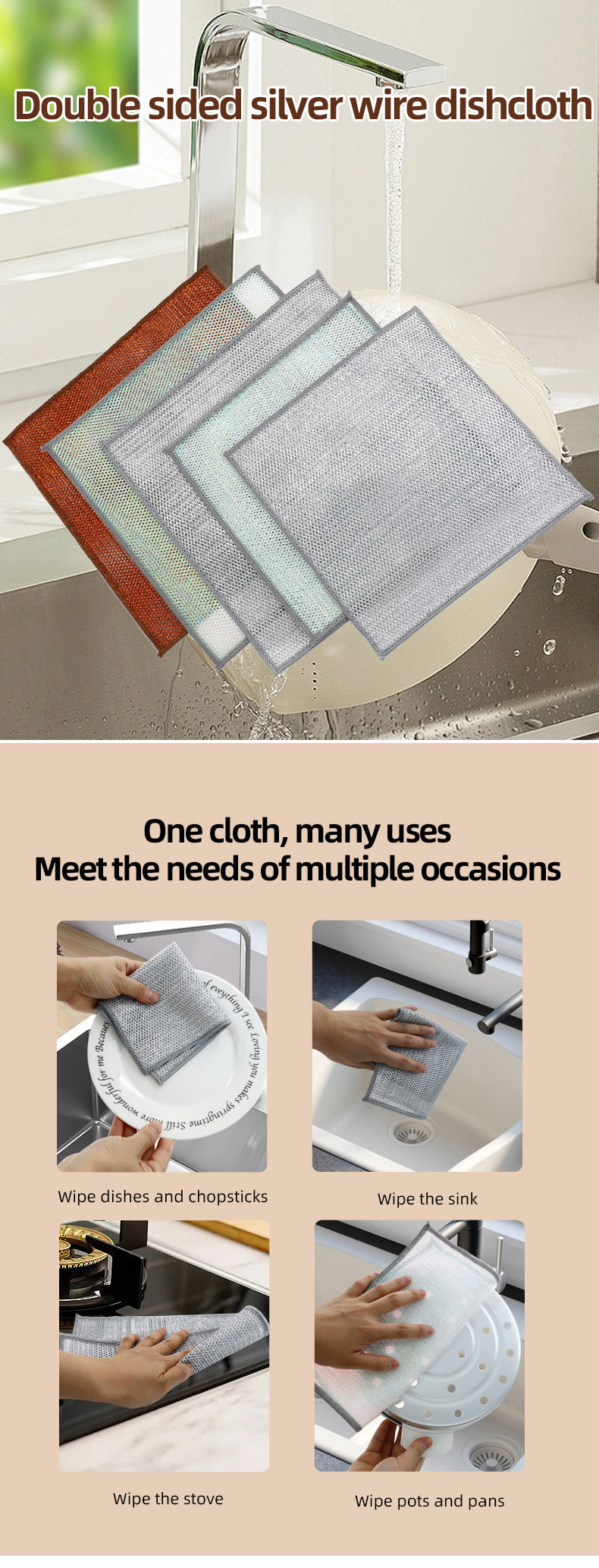 Serbet kawat perak dua sisi, Terbuat dari sutra perunggu, harganya sangat mahal; Tanpa lapisan, tanpa bedak, tanpa luntur; Tanpa minyak, tanpa minyak, goresan kuat namun tidak merusak peralatan masak. Terbuat dari sutra warna-warni, berminyak dan tidak lengket, dengan nilai penampilan tinggi; Tanpa lapisan, tanpa tetesan bubuk, tanpa warna memudar; Goresan yang kuat tetapi tidak merusak peralatan masak.
